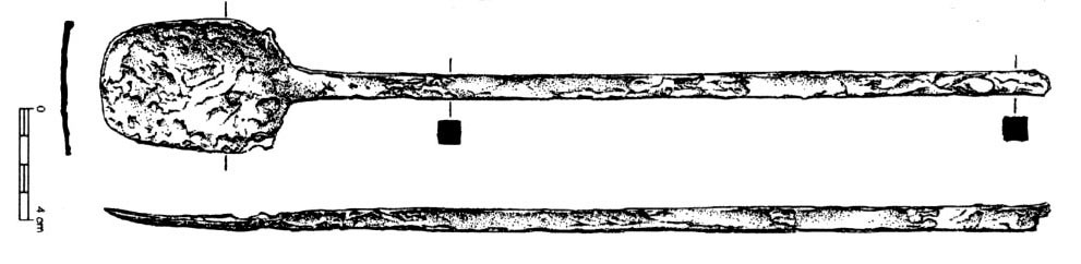 Výhňová lopatka s listem lehce trapezovitého tvaru se čtyřhranou rukojetí,délka 342 mm, šířka listu 48 mm, hmotnost 160,5 g, nález Bezdědovice.