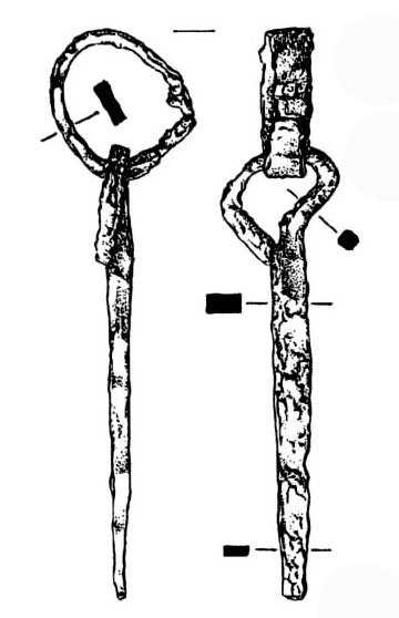 Hřeb (?) z ploché čtyřhranné tyčinky s jedním koncem stočeným v očko, s navlečeným kroužkem z plochého pásku, délka hřebu 109 mm, průměr kroužku 35 mm; hřeb hmostnost 22 g, kroužek hmostnost 16 g, nález Bězdědovice