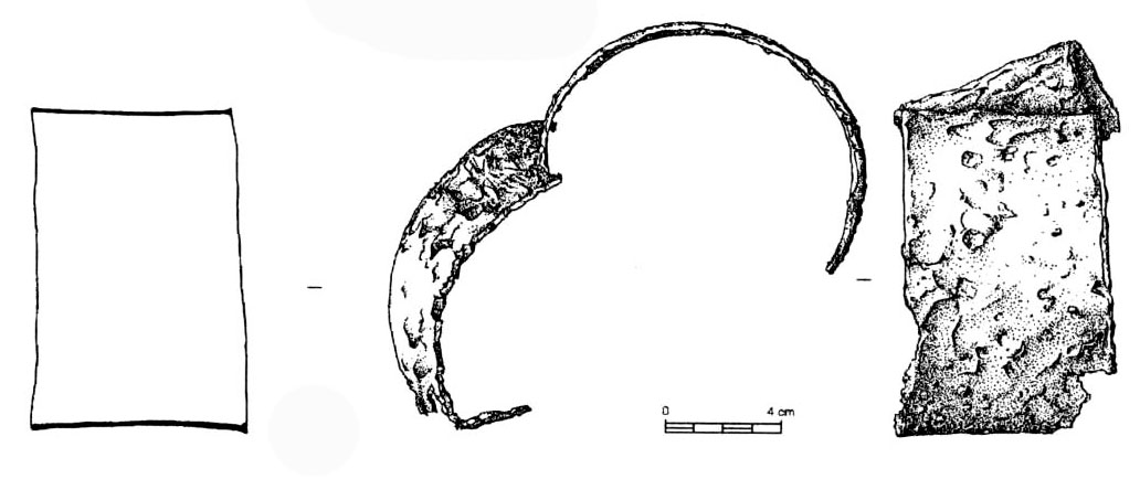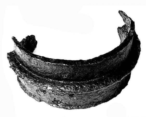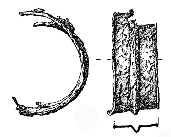 Kování náboje (hlavy) kola s ven vyhnutými okraji a středovým žebrem, zachovány ca. 2/3 ve 2 fragmentech, šířka 53-56, průměr ca. 130; hmotnost 192 g, nález Bězdědovice