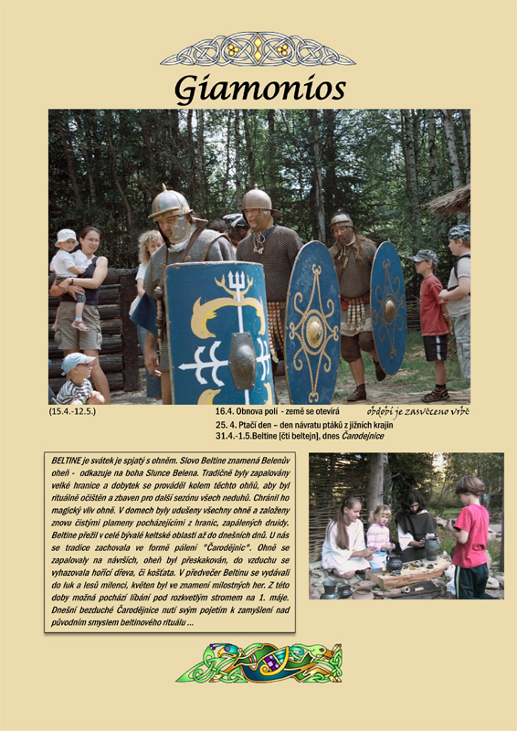 giamoniosBELTINE je svátek je spjatý s ohněm. Slovo Beltine znamená Belenův oheň - odkazuje na boha Slunce Belena. Tradičně byly zapalovány velké hranice a dobytek se prováděl kolem těchto ohňů, aby byl rituálně očištěn a zbaven pro další sezónu všech neduhů. Chránil ho magický vliv ohně. V domech byly udušeny všechny ohně a založeny znovu čistými plameny pocházejícími z hranic, zapálených druidy. Beltine přežil v celé bývalé keltské oblasti až do dnešních dnů. U nás se tradice zachovala ve formě pálení "Čarodějnic". Ohně se zapalovaly na návrších, oheň byl přeskakován, do vzduchu se vyhazovala hořící dřeva, či košťata. V předvečer Beltinu se vydávali do luk a lesů milenci, květen byl ve znamení milostných her. Z této doby možná pochází líbání pod rozkvetlým stromem na 1. máje. Dnešní bezduché Čarodějnice nutí svým pojetím k zamyšlení nad původním smyslem beltinového rituálu…